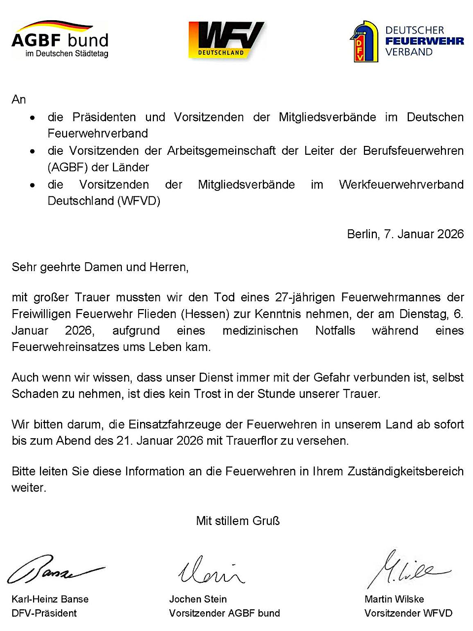 VW bitten darum, die Einsatzfahrzeuge der Feuemehren in unserem Land ab sofort bis zum Abend des 21. Januar 2026 mit Trauerflor zu versehen.